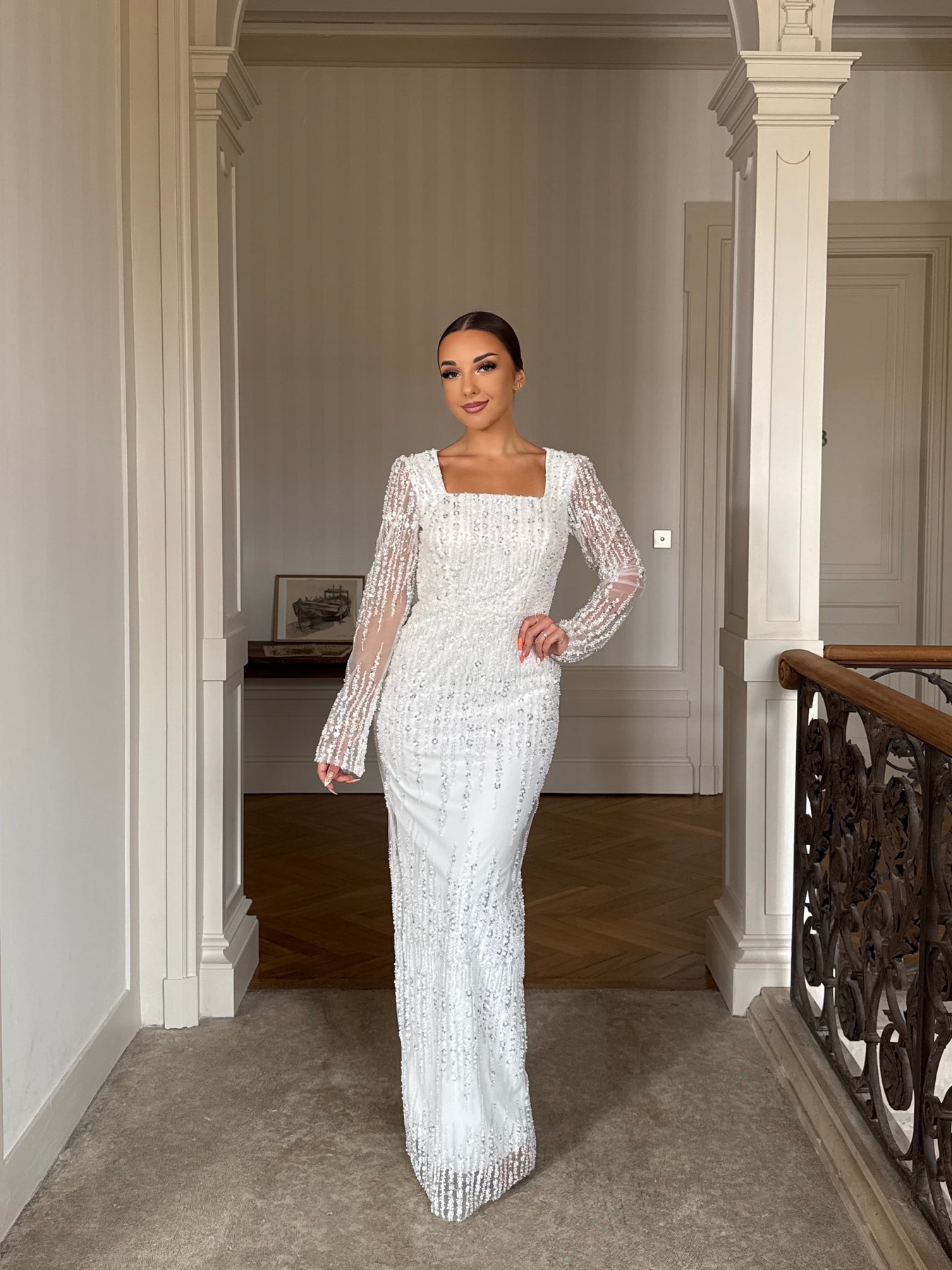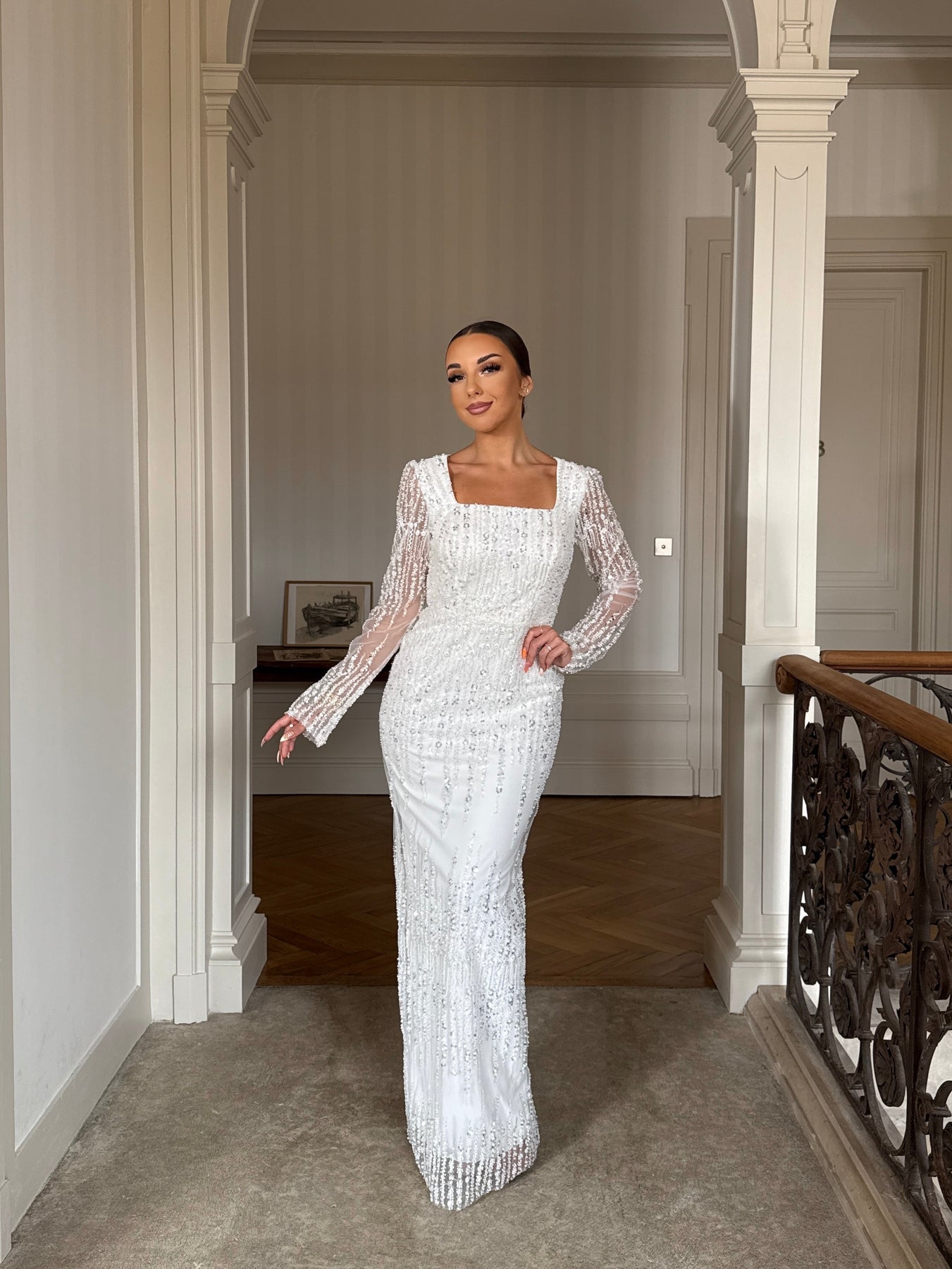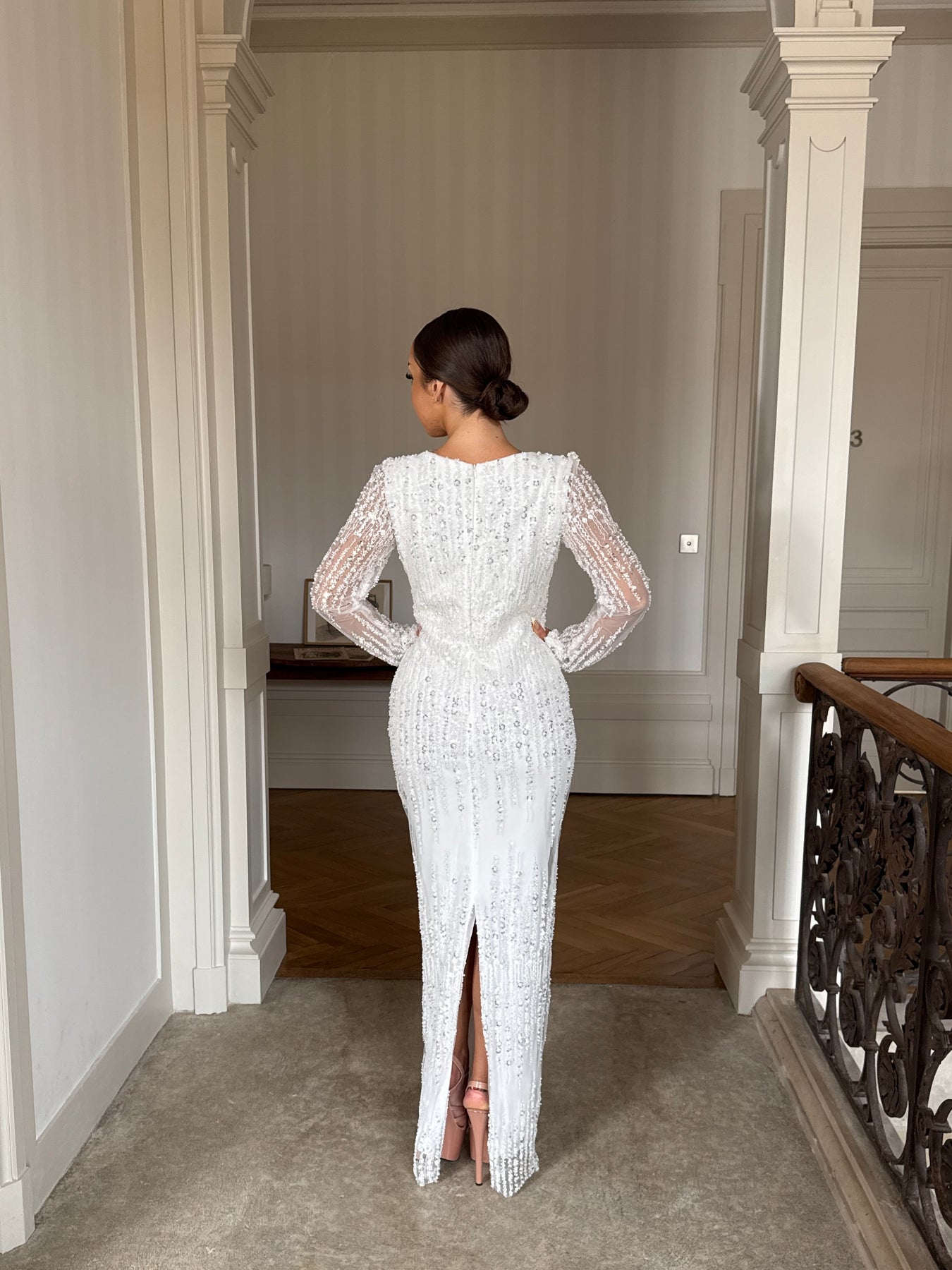Longue robe de soirée blanc, avec fente à l'arrière.