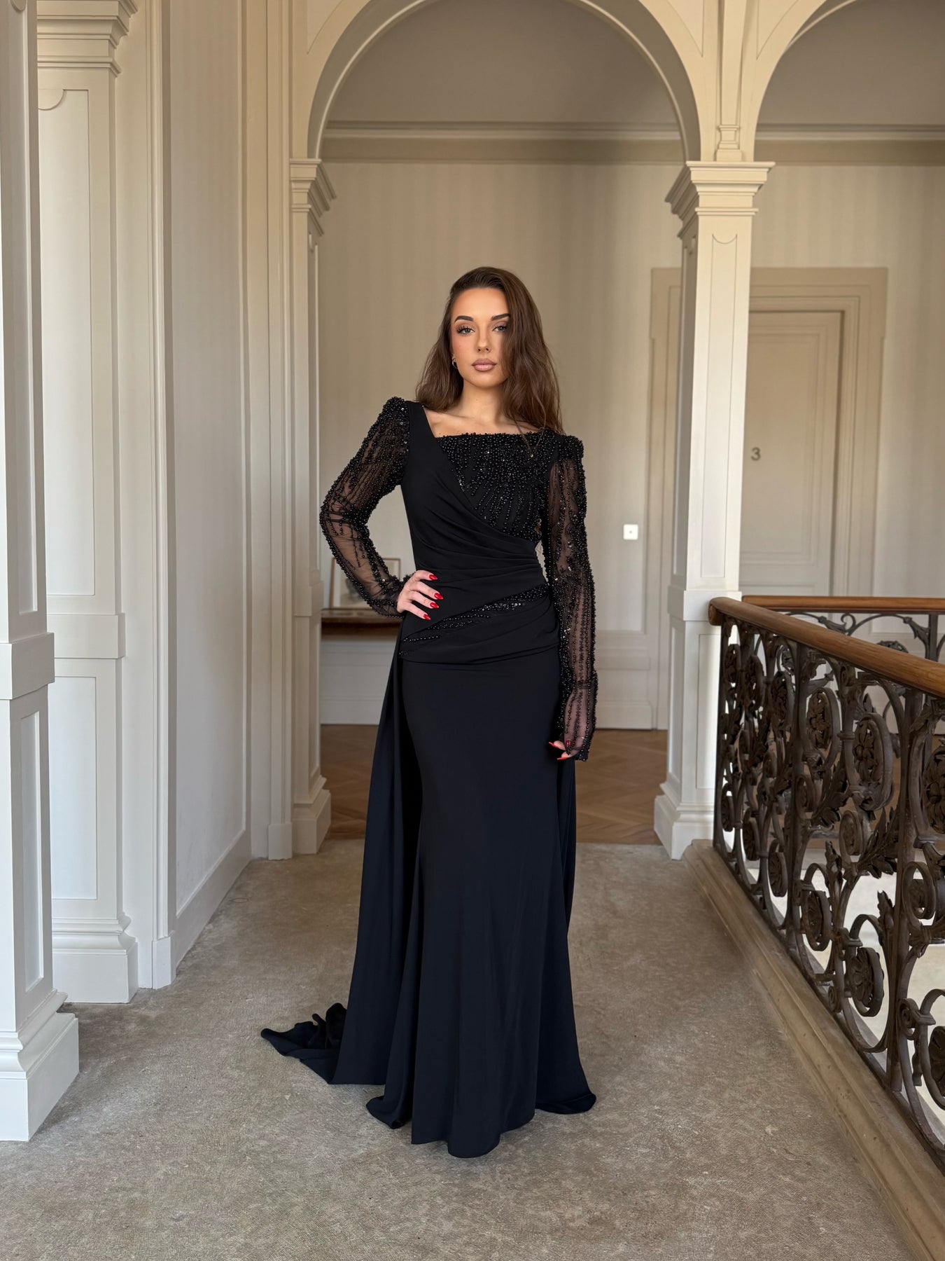 Longue robe de soirée noir sans fente, manche longue, col asymétrique avec une traine pour tout type d'événement, mariage, gala cérémonie