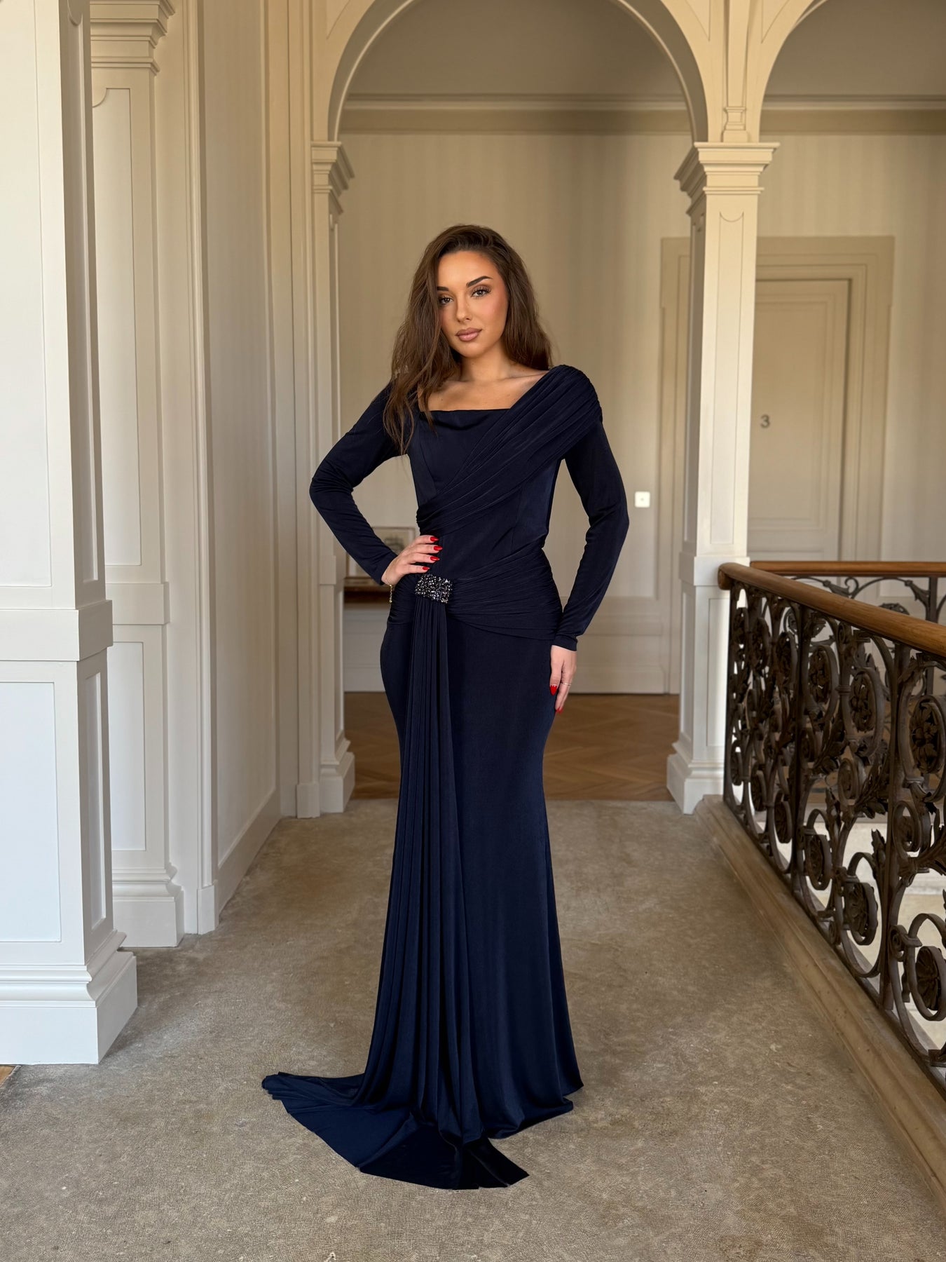 Longue robe de soirée bleu marine élégante, col carré avec effet drapé, sans fente, manche longue pour tout type d'événement, mariage, gala, cérémonie,
