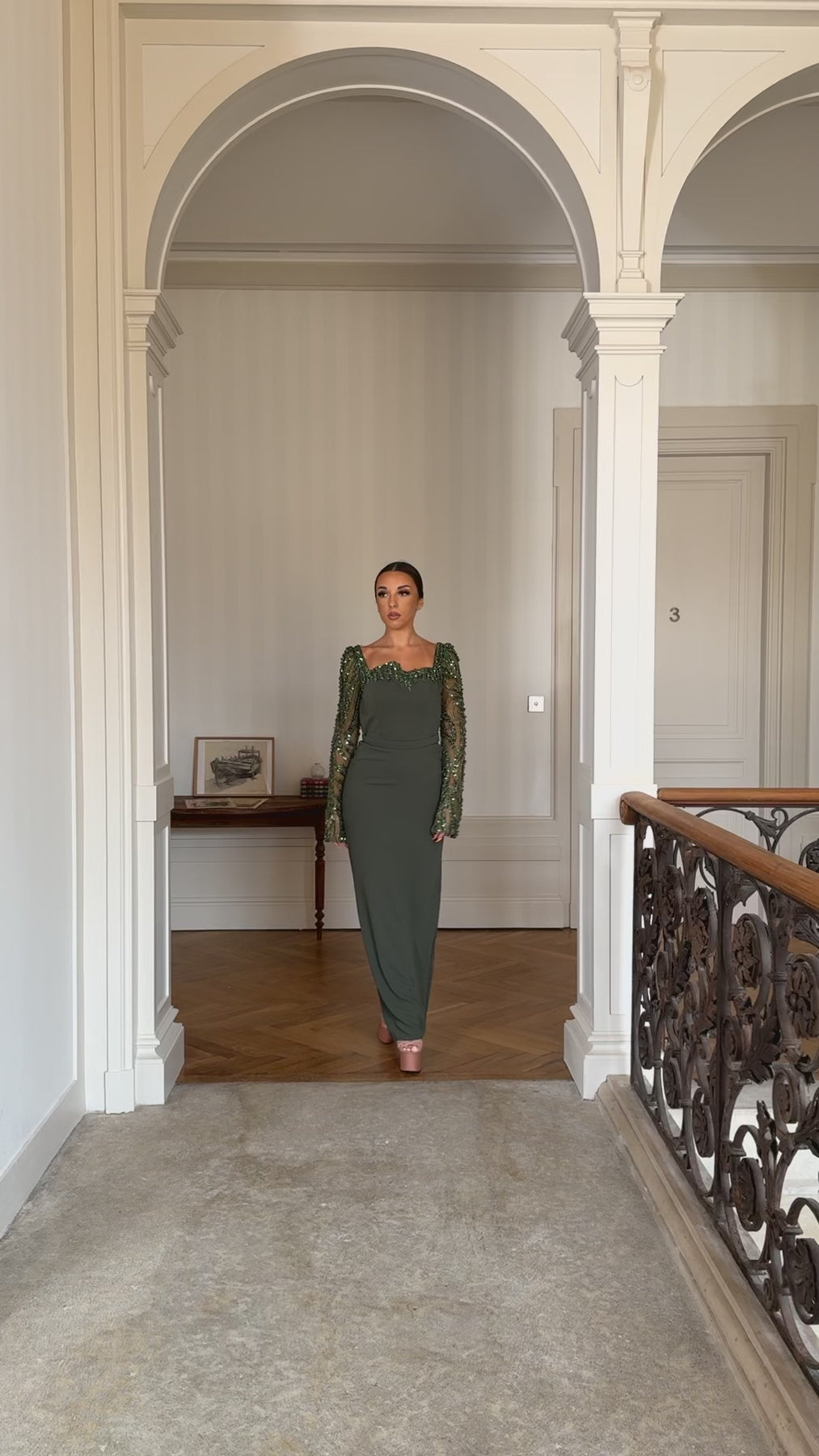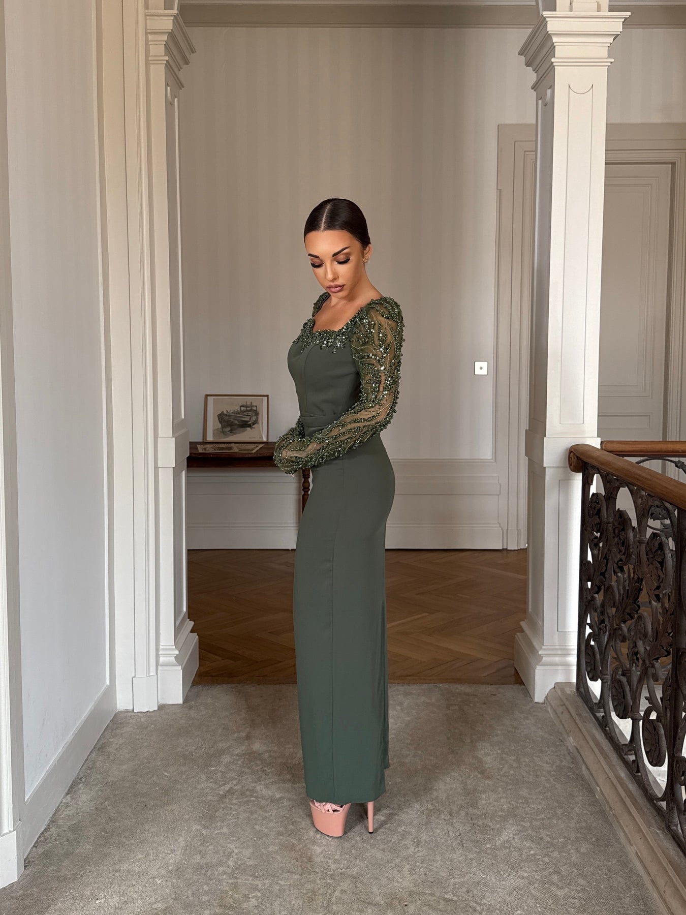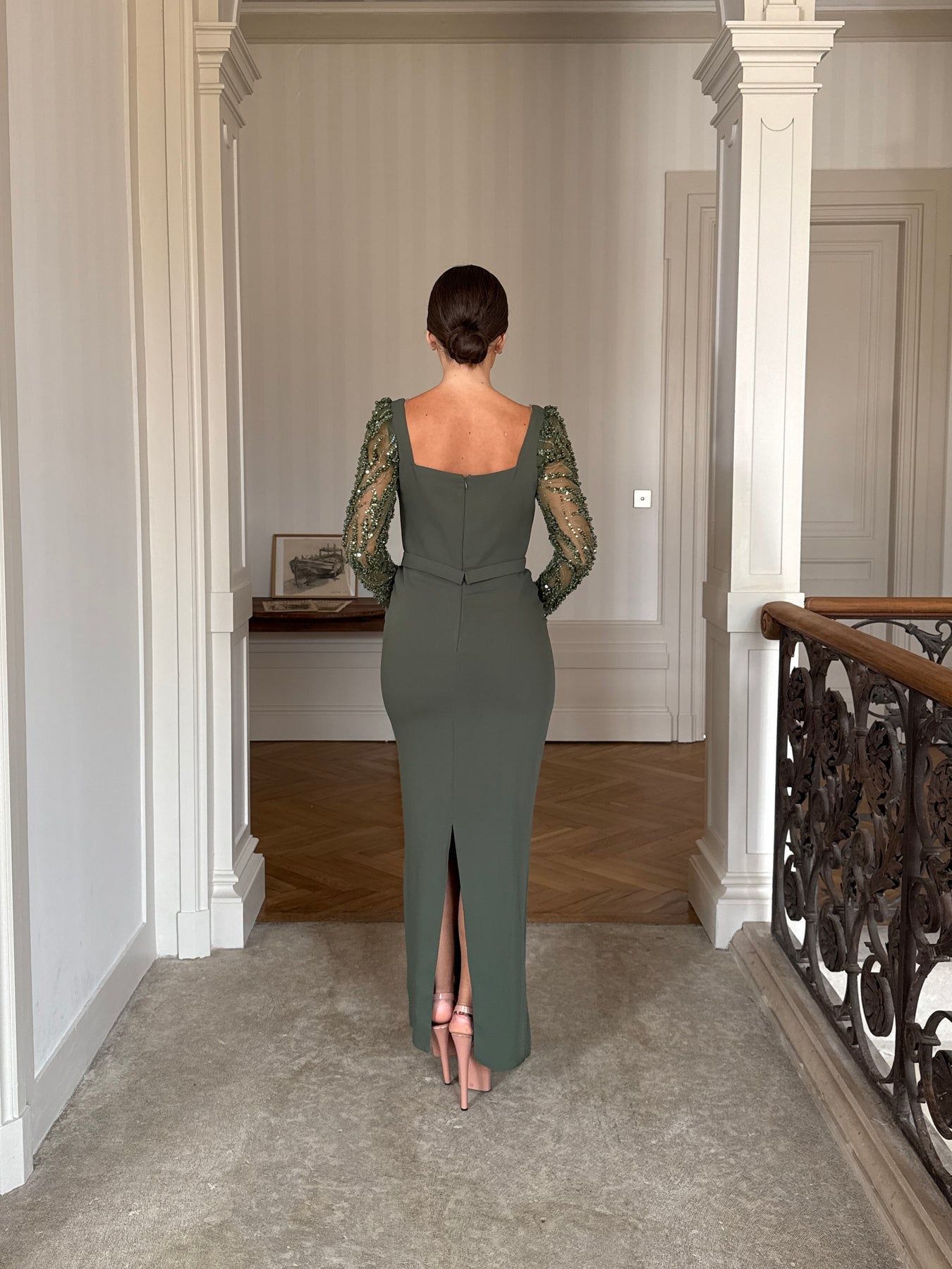 Longue robe de soirée kaki, avec une fente à l'arrière.