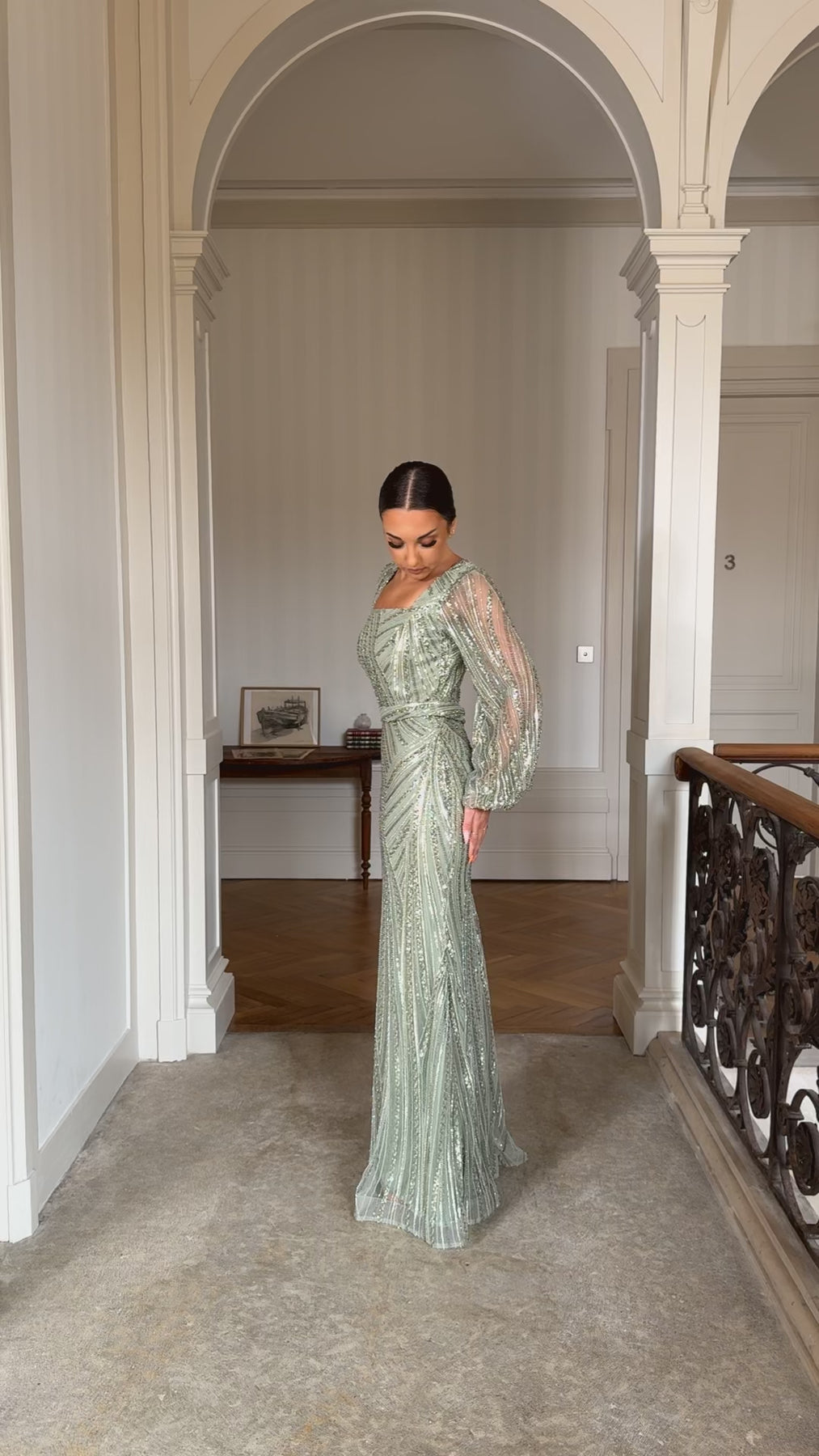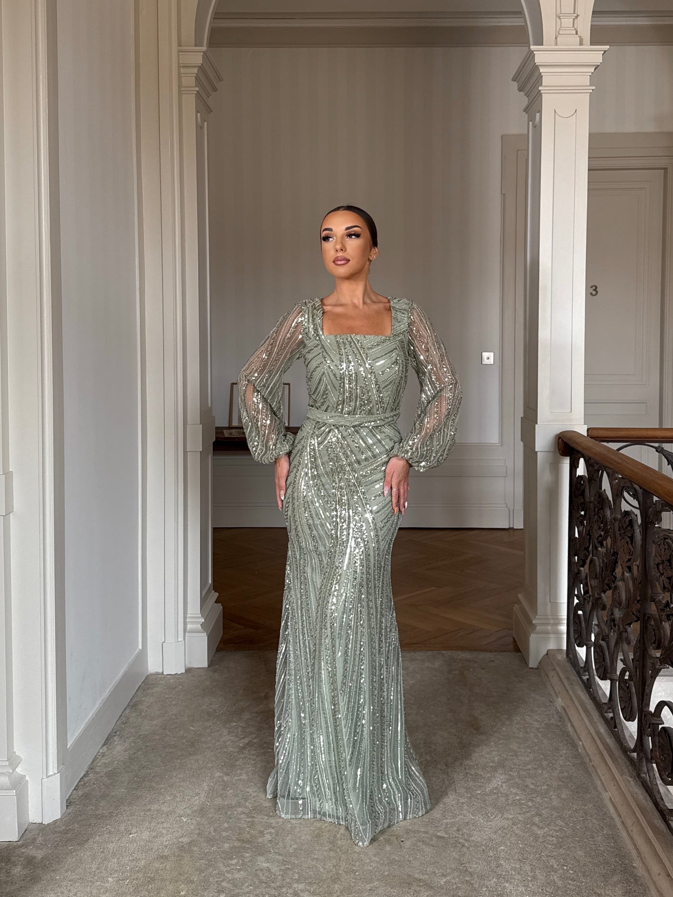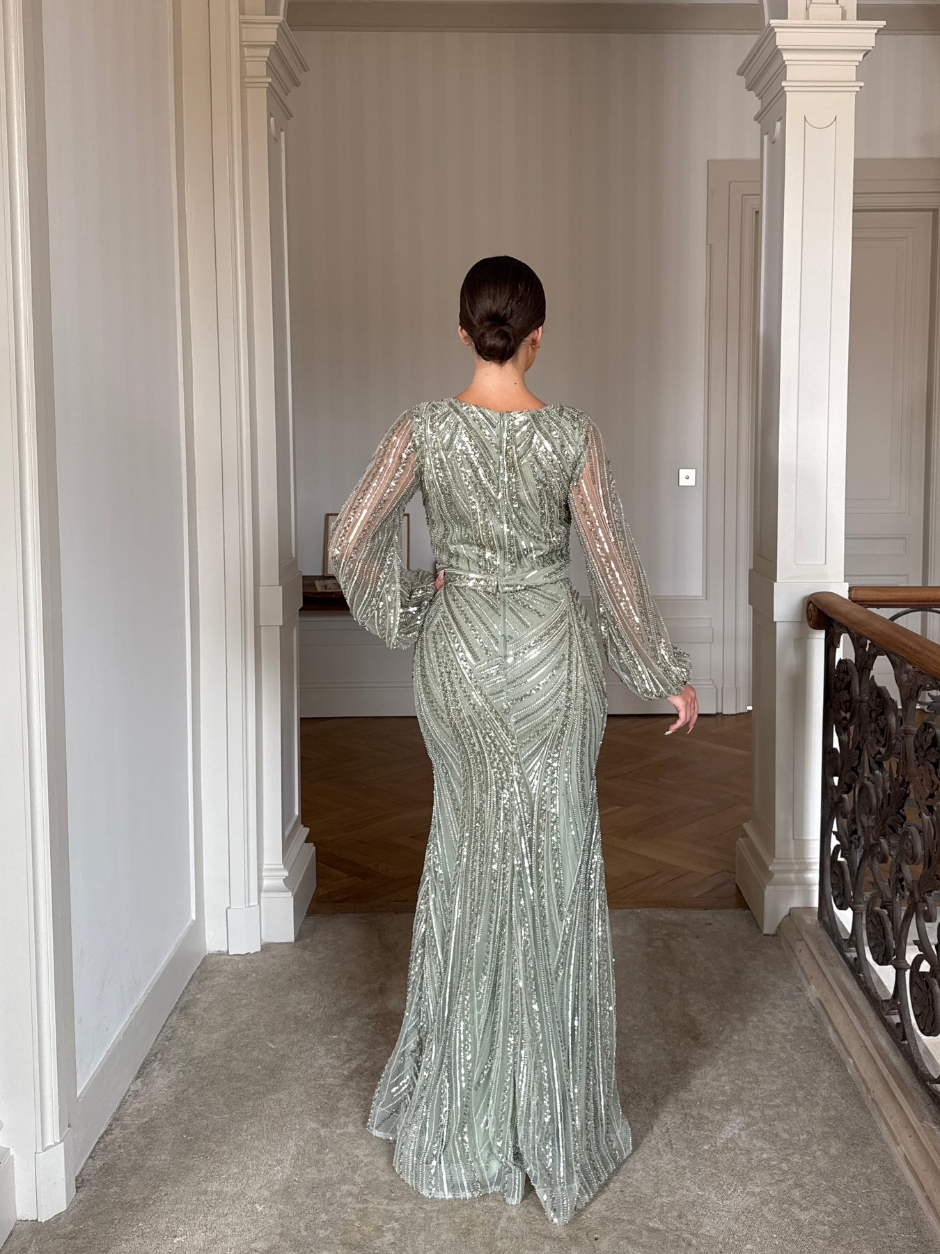 Longue robe de soirée vert d'eau, sans fente.