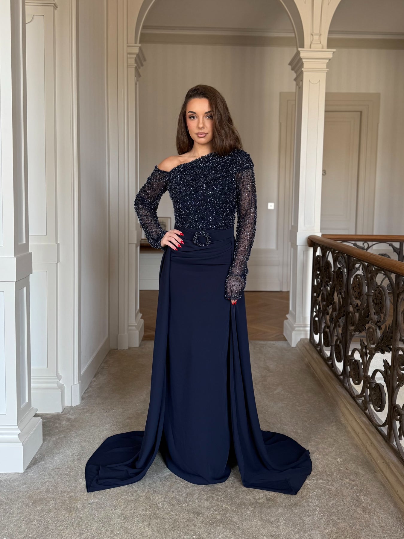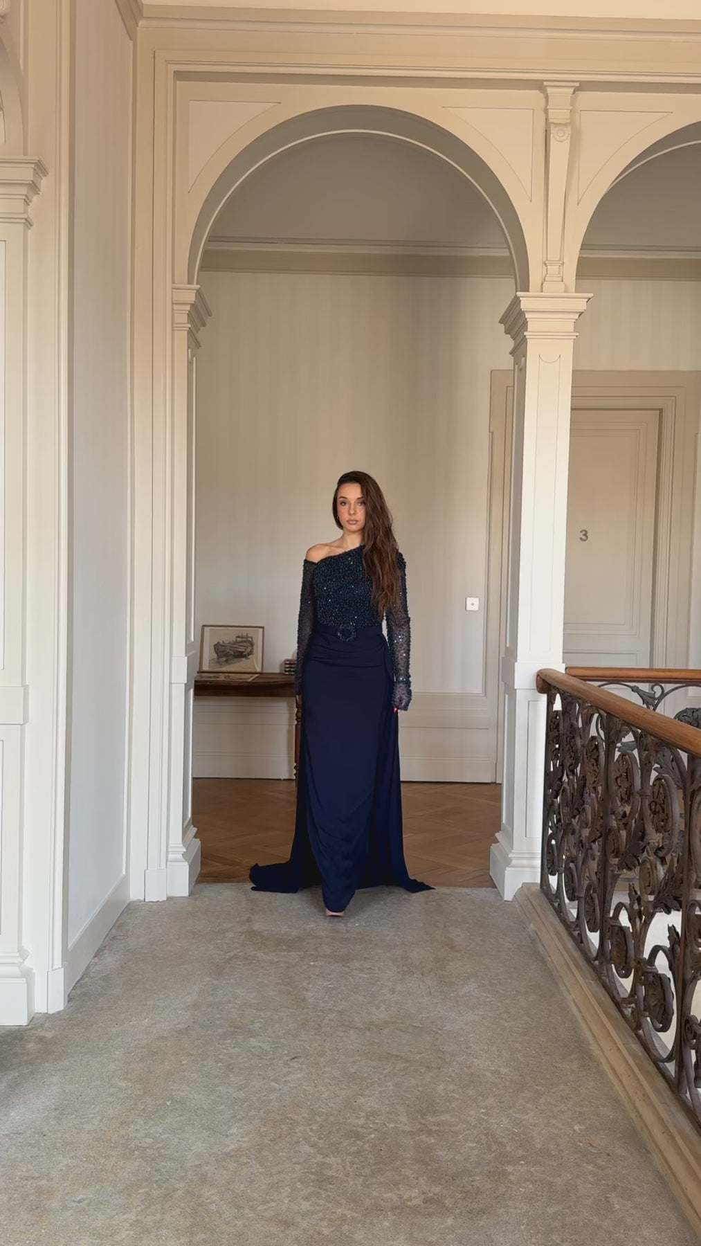 Parce que les détails apportent toute l’âme d’une tenue, cette élégante robe de soirée bleu marine dévoile un haut richement perlé, parfaitement lumineux. Ses manches longues transparentes ajoutent douceur, finesse et mouvement. Par ailleurs, sa ceinture bijou marque subtilement la taille. Ainsi, elle combine confort, élégance et sophistication, toujours avec une allure très harmonieuse.