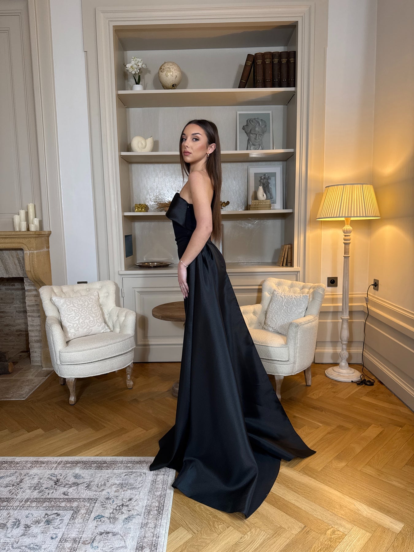 Cette longue robe de soirée noire se distingue par son col bustier, qui sublime le décolleté avec délicatesse. De plus, elle est sans manches, ce qui apporte une touche de féminité et de modernité. Contrairement à d’autres modèles plus audacieux, cette robe ne possède pas de fente, garantissant une allure fluide, élégante et parfaitement maîtrisée.