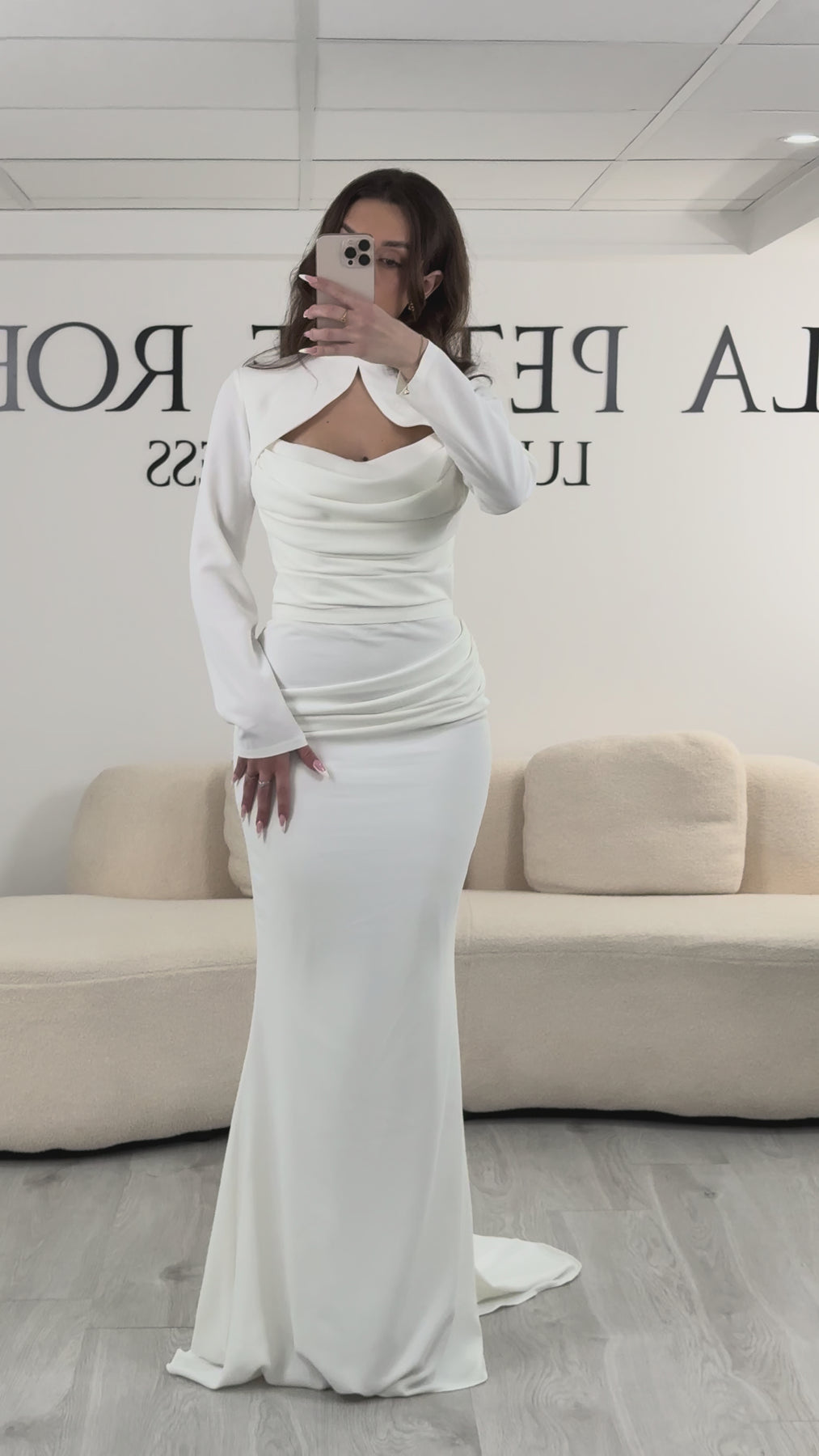 Takket være dens modulære design kan den fjernes for at afsløre en mere strømlinet halsudskæring og subtilt transformere kjolens stil. Dette giver dig mulighed for... to looks i ét : et elegant og struktureret look til ceremonien med boleroen, og derefter en mere moderne og strømlinet silhuet uden.