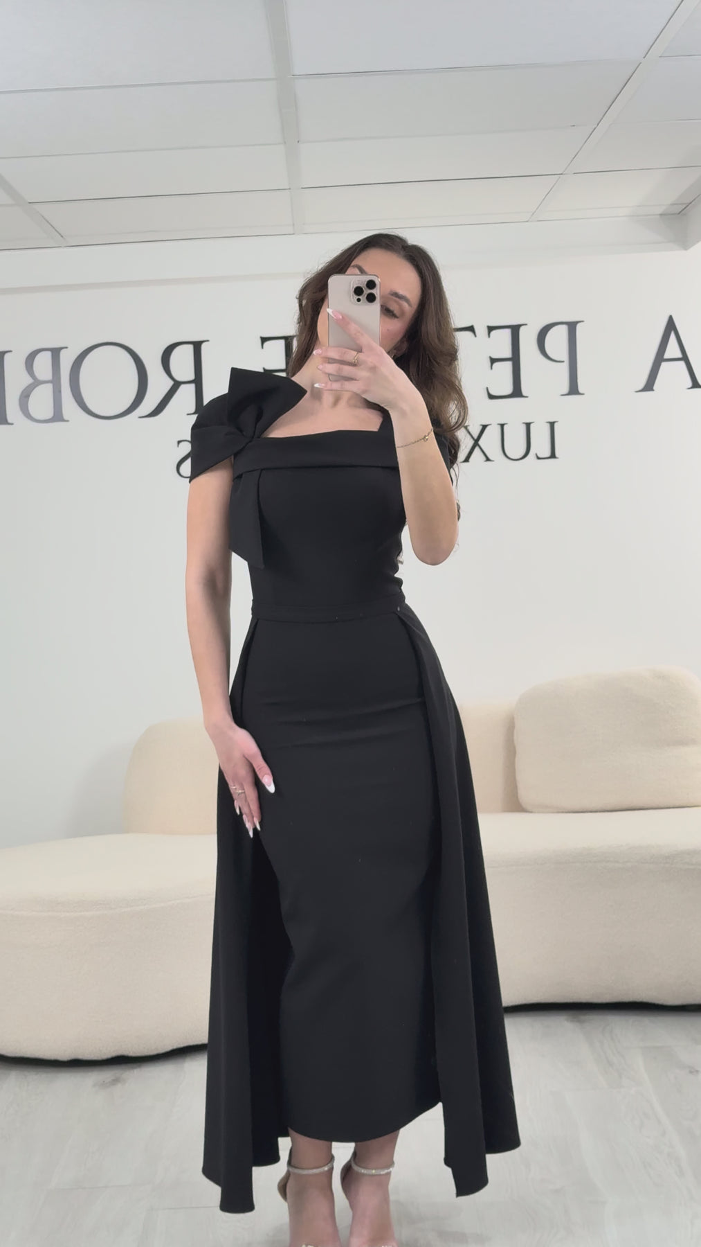 Der Sort aftenkjole Denne kjole er betagende med sin elegante og tidløse stil og fanger straks øjet med sit elegante og afbalancerede snit. Dens midi-længde fremhæver diskret figuren og skaber en slank og perfekt harmonisk silhuet. Derudover tilføjer den sorte farve et strejf af sofistikering, der overgår trends.