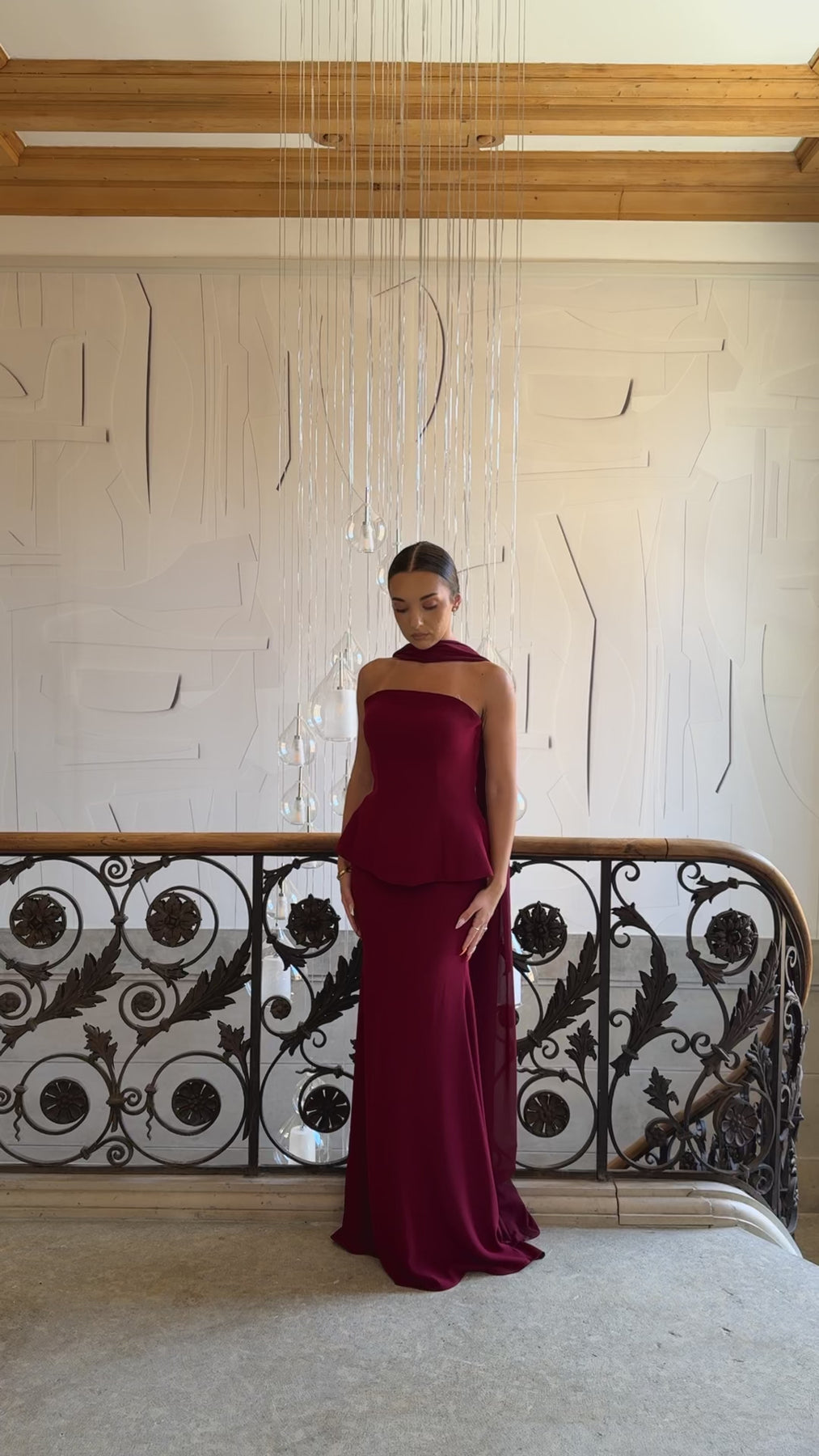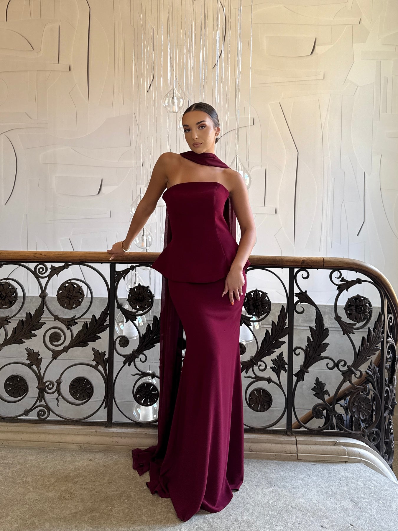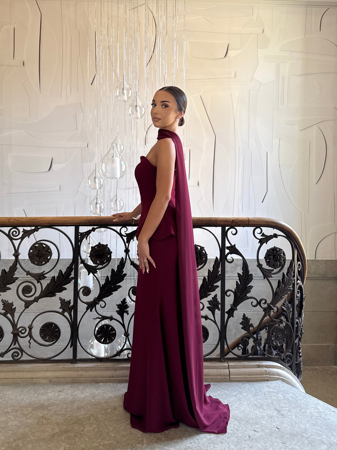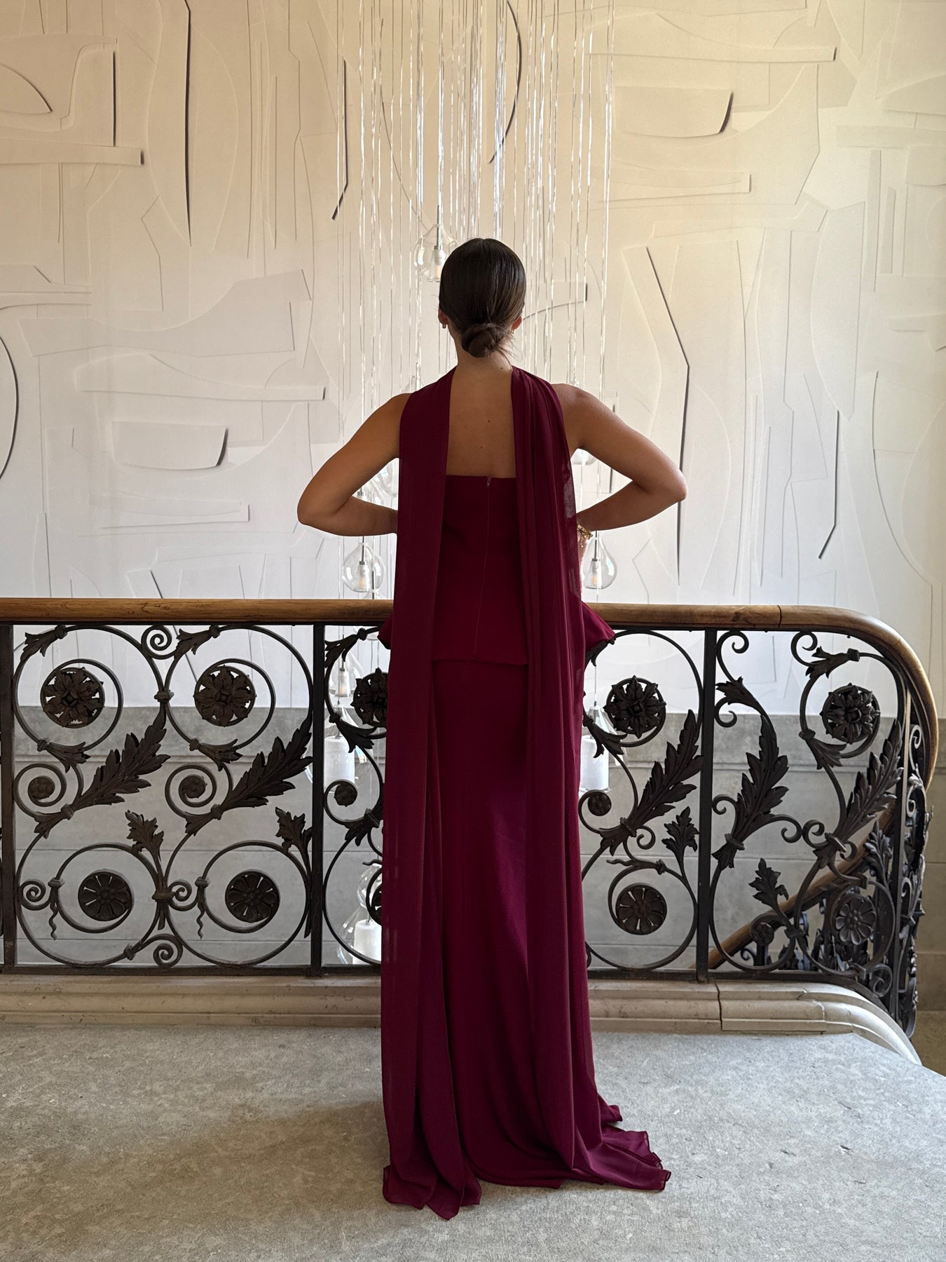 Langes burgunderfarbenes Abendkleid ohne Schlitz.