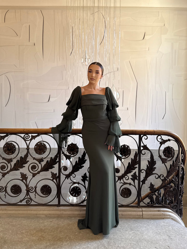 Darüber hinaus elegantes khakifarbenes Abendkleid ist die perfekte Wahl für eine Zeremonie, Hochzeit oder ein Galadinner. Dank des fehlenden Schlitzes behält es einen edlen und fließenden Look. Darüber hinaus passt sein raffinierter Khaki-Ton zu allen Hauttönen. Die langen Ärmel und der quadratische Kragen verleihen ihm einen einzigartigen Charme und vereinen klassische Eleganz mit selbstbewusster Modernität.