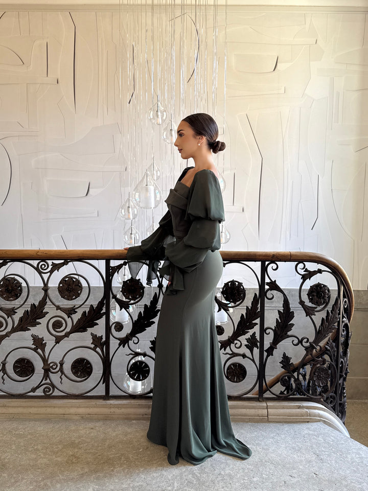 Zusammenfassend lässt sich sagen, dass elegantes khakifarbenes Abendkleid verkörpert pure Eleganz. Dank des quadratischen Ausschnitts, der langen Ärmel und des fehlenden Schlitzes schmeichelt es der Figur und sorgt gleichzeitig für Komfort und Ausgeglichenheit. Der dezente Khaki-Ton und der fließende Schnitt machen es zum perfekten Outfit, um bei all Ihren besonderen Anlässen selbstbewusst zu glänzen.