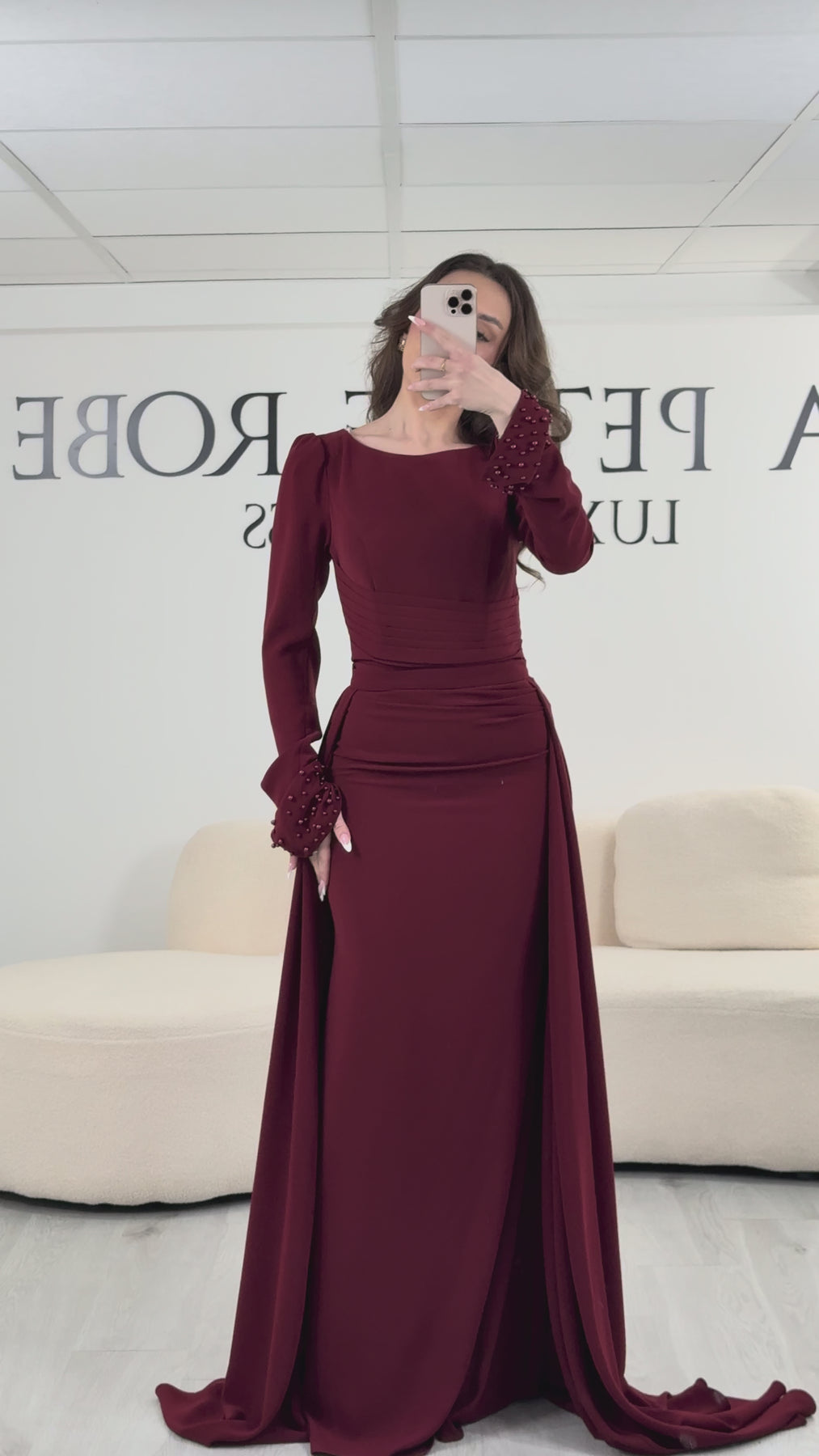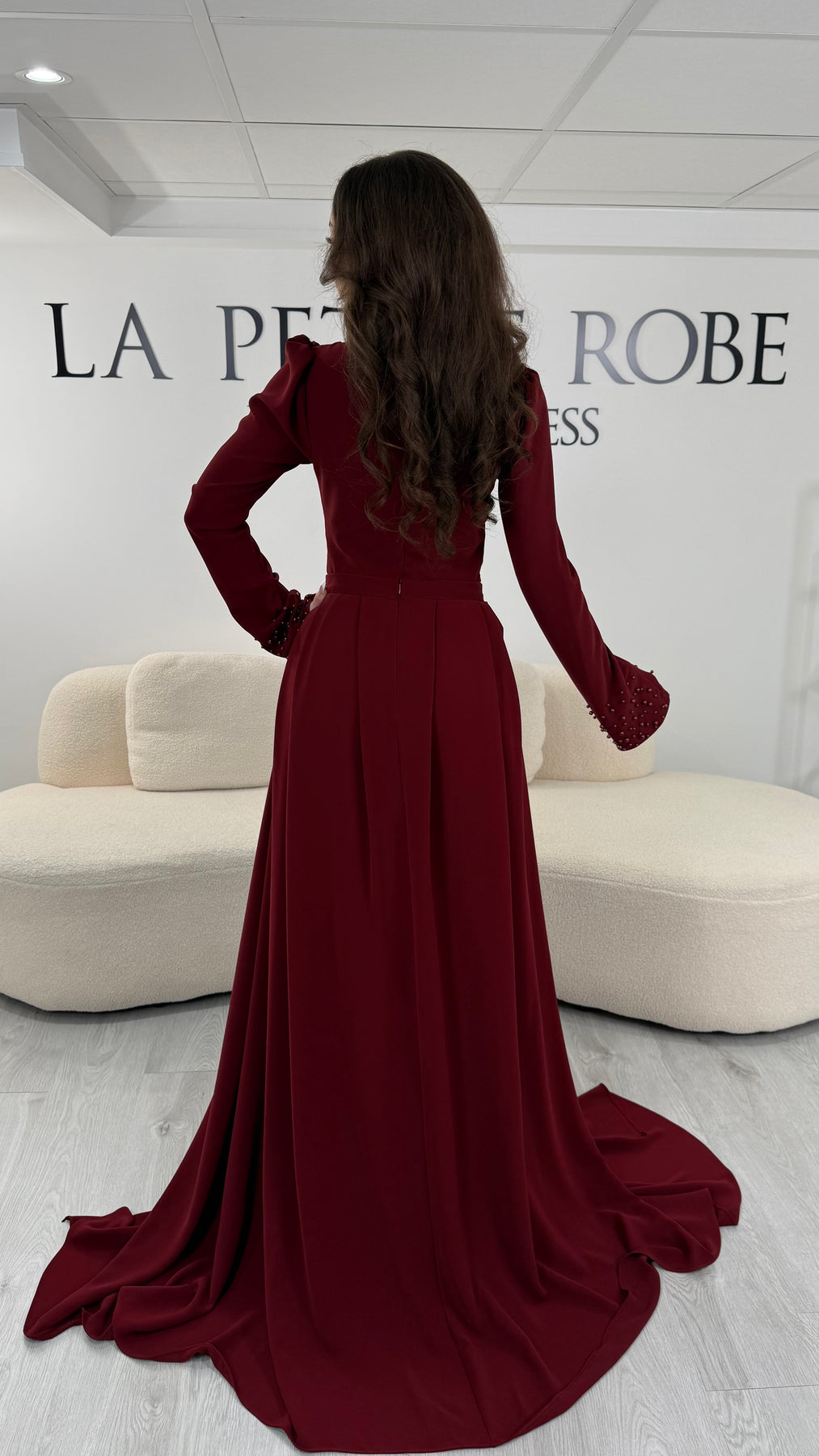 First of all, this Burgundy evening dress This dress is distinguished by its elegant, structured round neckline. This neckline frames the neck delicately and provides a harmonious finish. It subtly enhances the wearer's posture. Furthermore, the dress features fitted long sleeves, which reinforce its sophisticated look.
