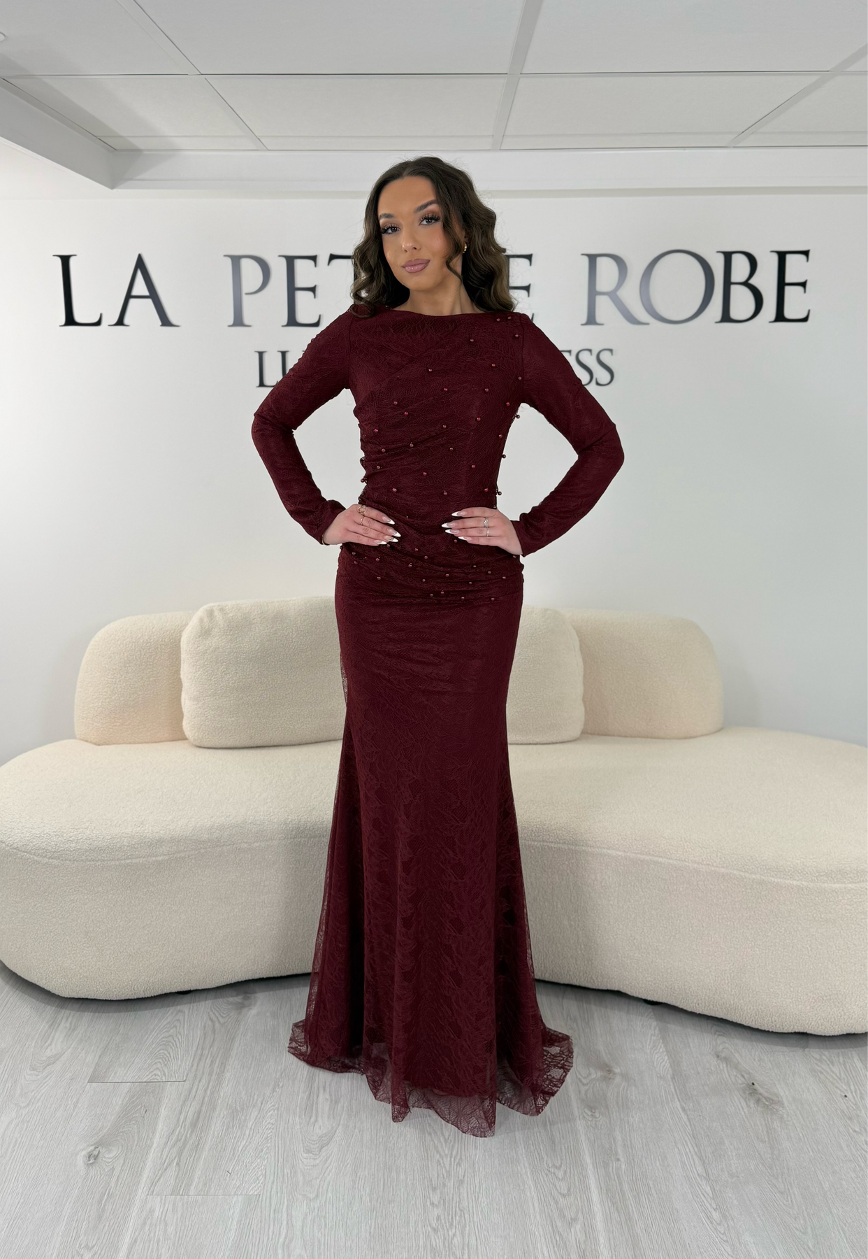 Indeed, this burgundy maxi dress It is distinguished by its delicate embroidery and beading. Furthermore, these details add texture and a touch of light. Next, the Round neck, slightly high It offers an elegant and structured look. Furthermore, the long sleeves enhance its chic and flattering appearance. This burgundy dress is therefore ideal for a wedding, reception, or formal evening event. Moreover, its fitted cut subtly accentuates the figure.