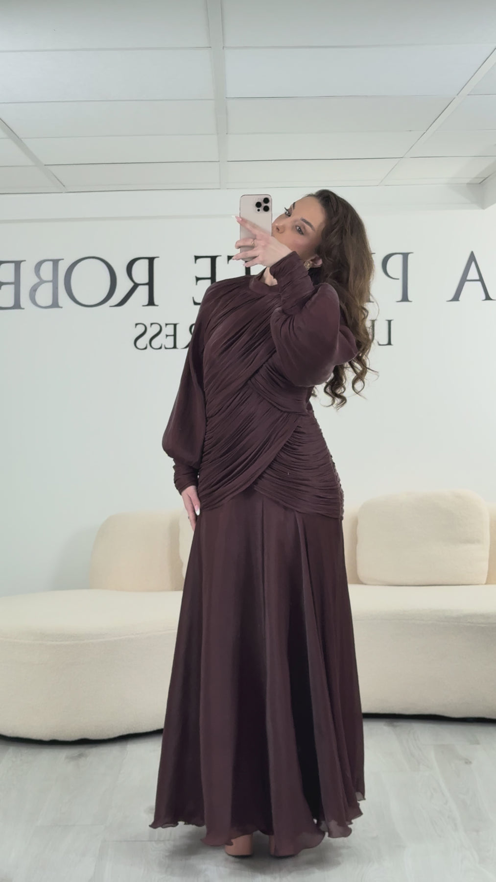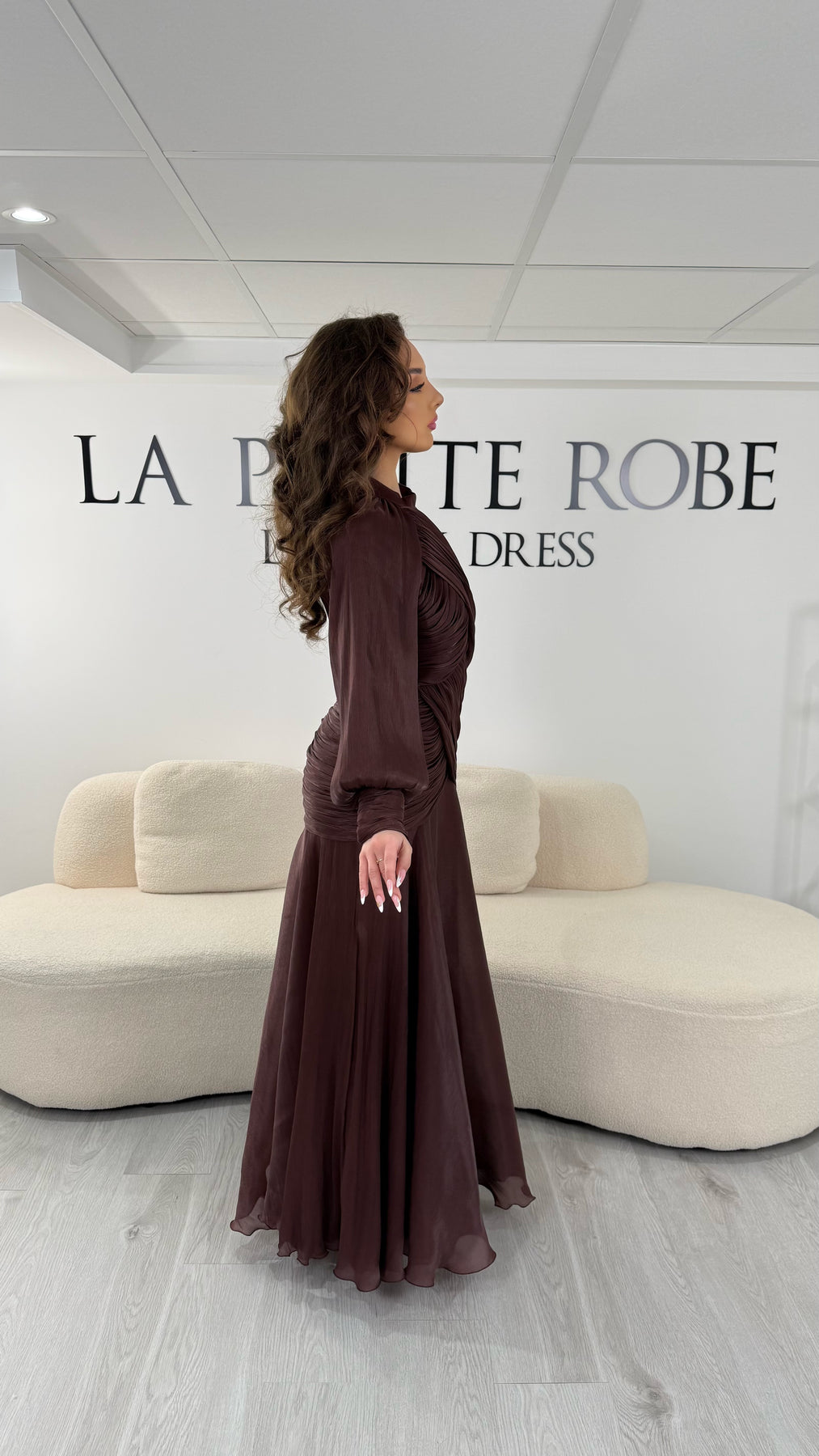 This Modest brown evening dress It's perfect for a wedding, reception, or formal evening. Its warm color complements elegant settings, and its long cut flatters various body types, allowing you to feel confident and sophisticated.