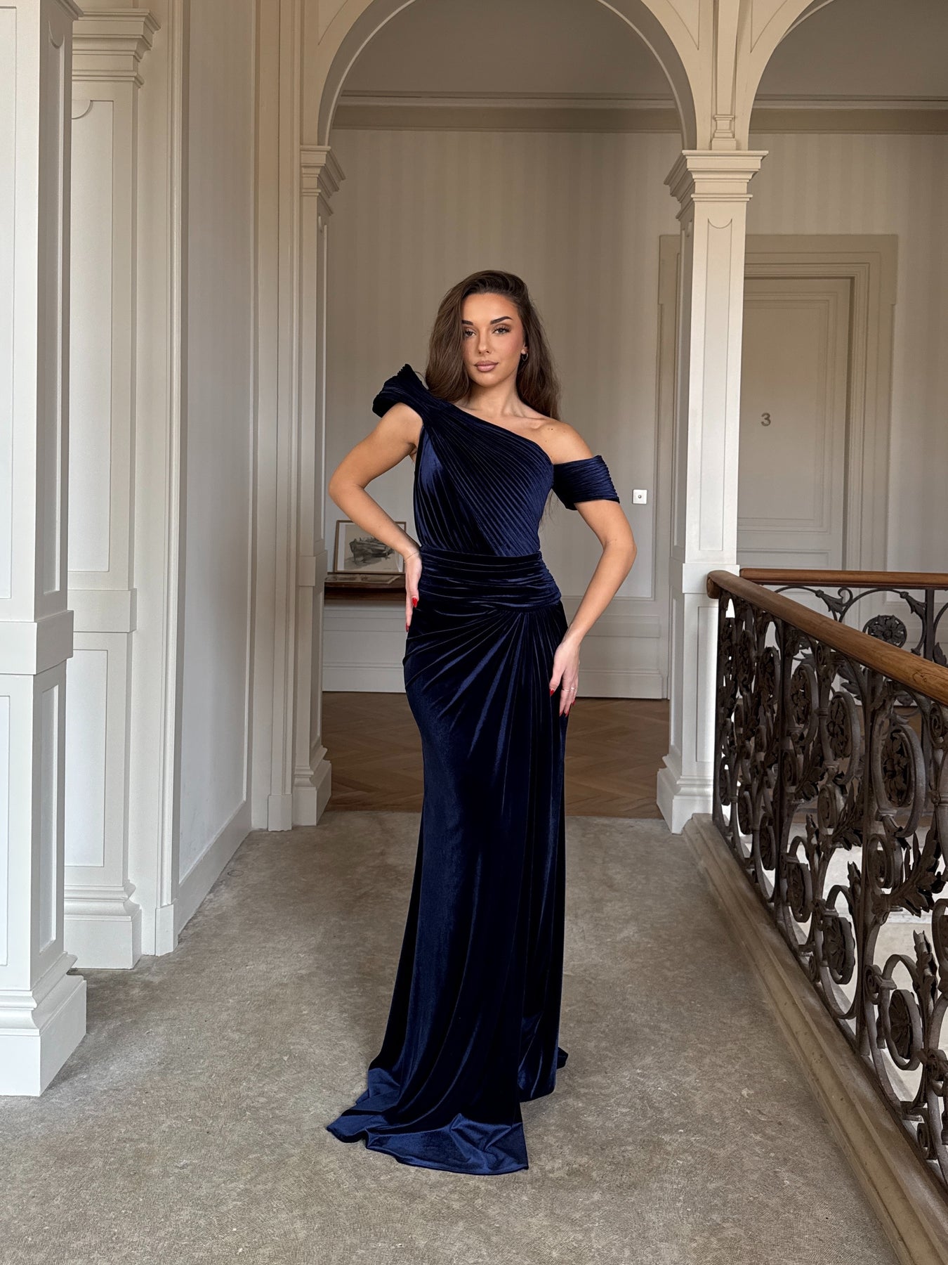 Elegant, long, chic navy blue velvet evening gown with a sleeveless, fitted cut. Perfect for weddings, galas, and formal events.