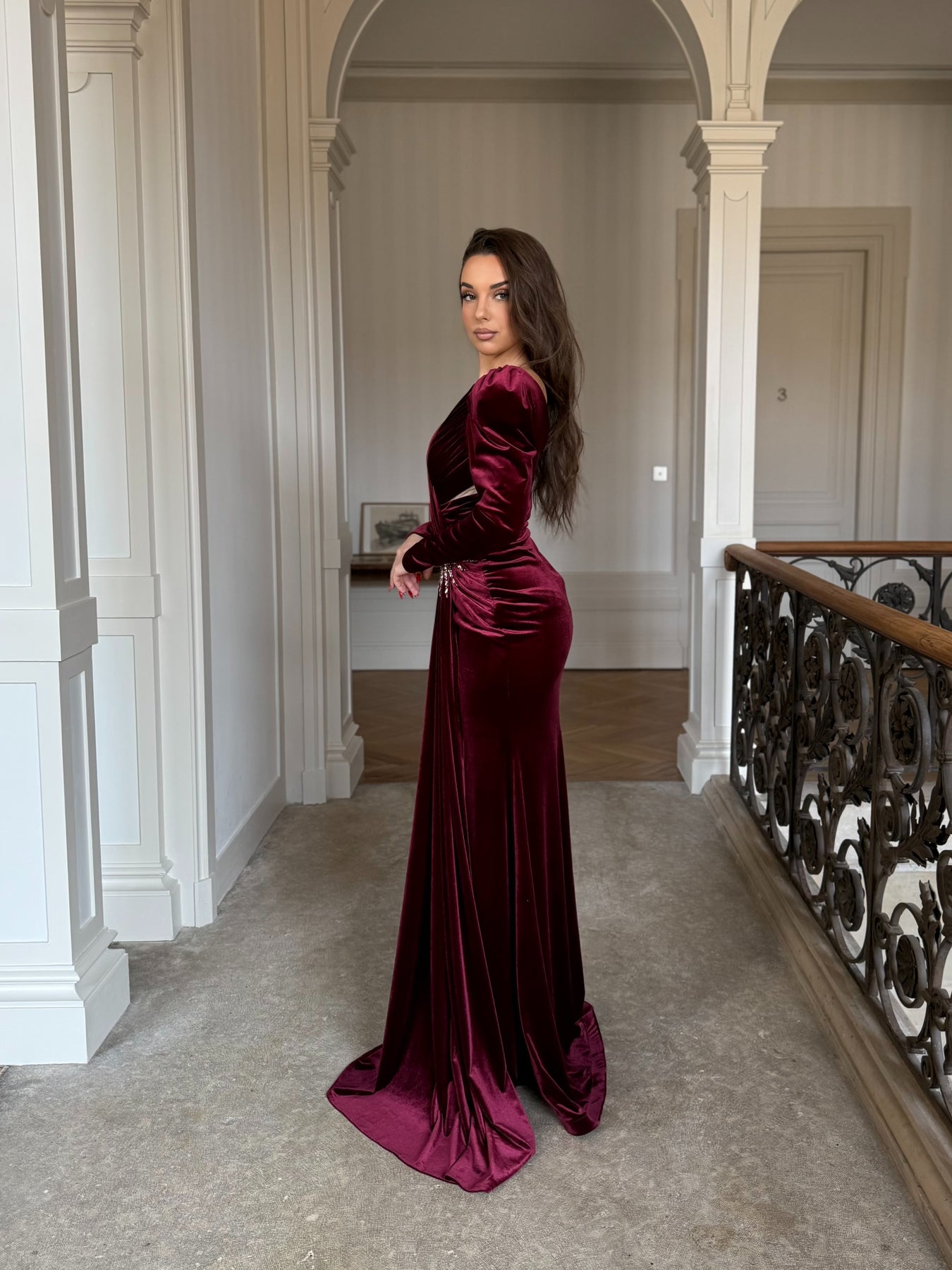 This burgundy velvet evening dress It is the perfect embodiment of elegance and refinement. First, its soft and luxurious velvet fabric offers a sophisticated look. Then, its V-neck adds a sensual touch, while the subtle slit gracefully enhances the silhouette.