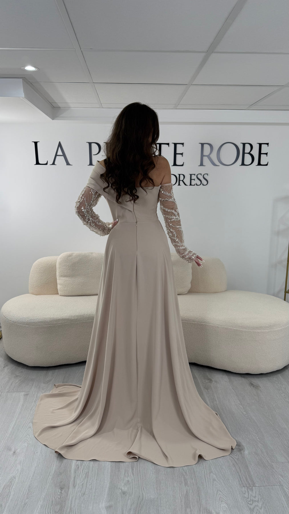 Um elegante vestido longo bege para a noite, concebido para o conforto.