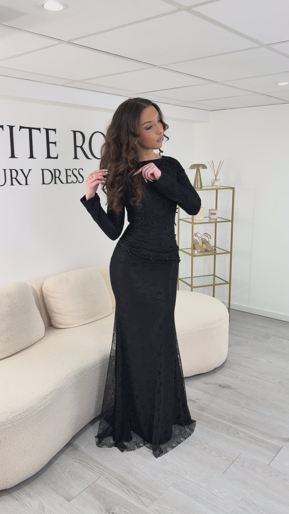 Gerçekten de bu uzun siyah elbise İnce işlemeleri ve boncuklarıyla öne çıkıyor. Dahası, bu detaylar doku ve hafif bir ışıltı katıyor. Ardından, Yuvarlak yaka, hafif yüksek Zarif ve şık bir görünüm sunuyor. Ayrıca, uzun kolları şık ve zarif görünümünü daha da güçlendiriyor. Bu siyah elbise bu nedenle düğün, resmi bir akşam etkinliği veya tören için idealdir. Dahası, vücuda oturan kesimi, fazla açık olmadan figürü güzel gösteriyor.